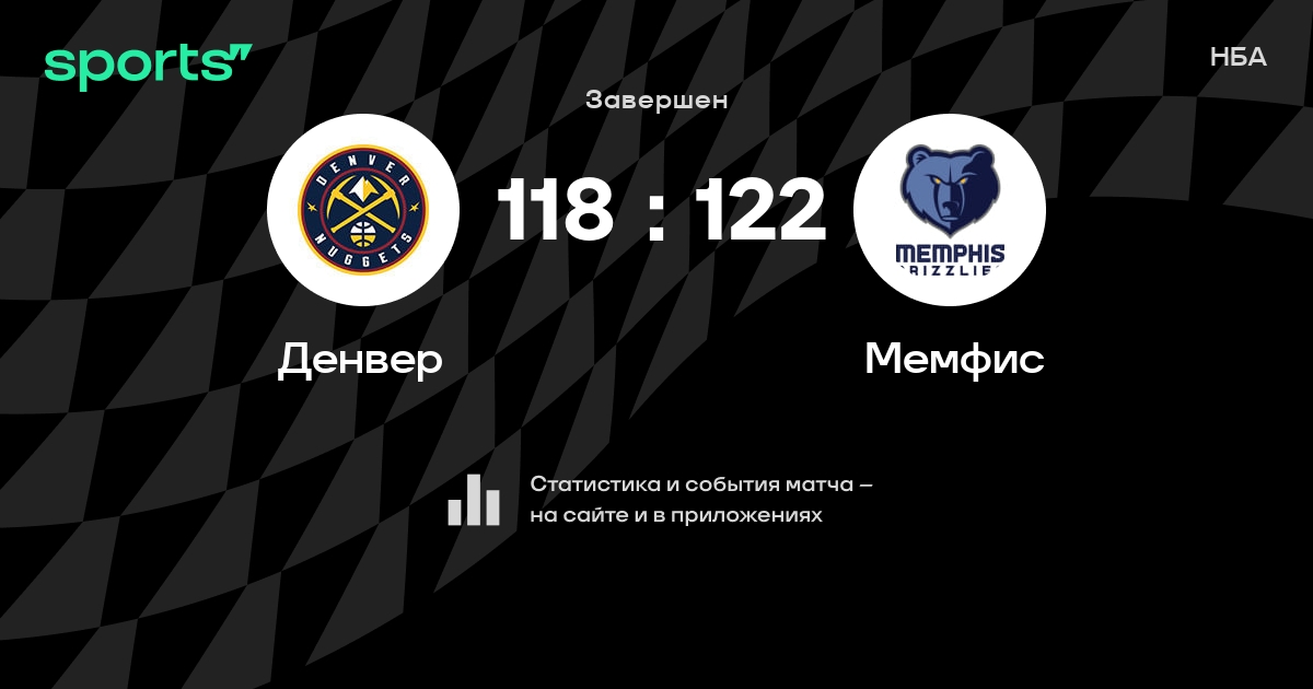 В прошедшем матче в рамках турнира НБА состоялась встреча команд Денвер - Мемфис в городе Денвер (США) на стадионе Ball Arena (вместимость - 18007) со счетом 118 : 122.