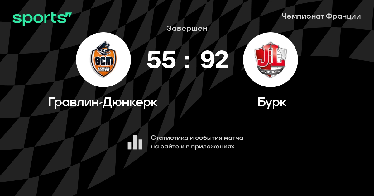 В прошедшем матче в рамках турнира Чемпионат Франции состоялась встреча команд Гравлин-Дюнкерк - Бурк в городе на стадионе Sportica со счетом 55 : 92.