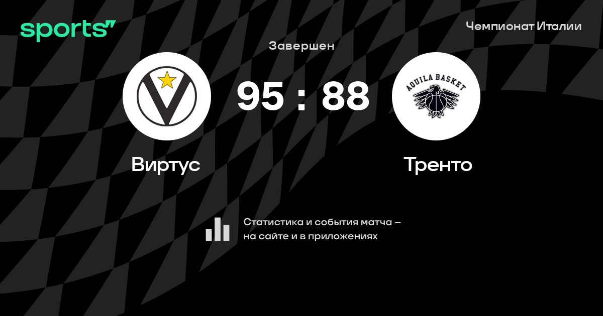 В прошедшем матче в рамках турнира Чемпионат Италии состоялась встреча команд Виртус - Тренто в городе Болонья (Италия) на стадионе Виртус Арена (вместимость - 9980)