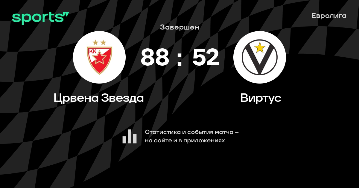 В прошедшем матче в рамках турнира Евролига состоялась встреча команд Црвена Звезда - Виртус в городе Белград (Сербия) на стадионе Белград Арена (вместимость - 22386)