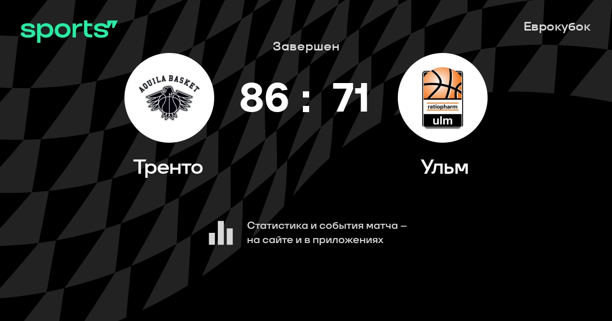 В прошедшем матче в рамках турнира Еврокубок состоялась встреча команд Тренто - Ульм в городе на стадионе PalaTrento со счетом 86 : 71.
