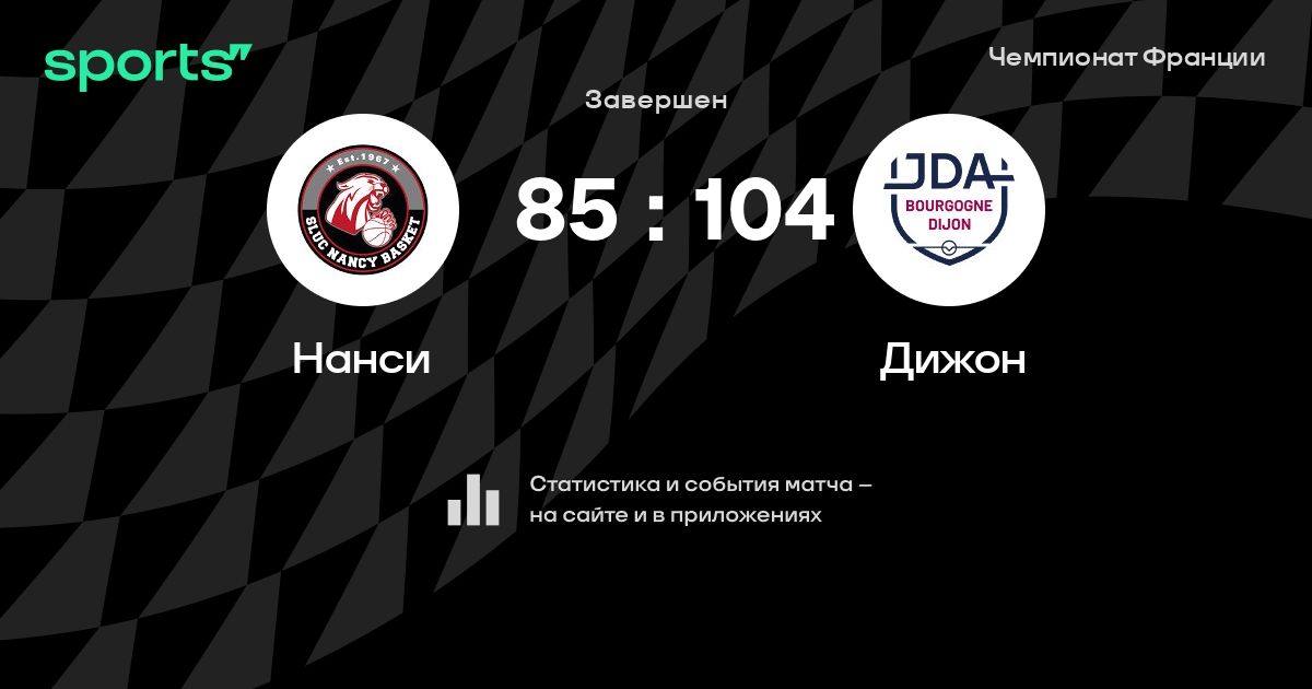 В прошедшем матче в рамках турнира Чемпионат Франции состоялась встреча команд Нанси - Дижон в городе на стадионе Palais des Sports Jean Weille со счетом 85 : 104.