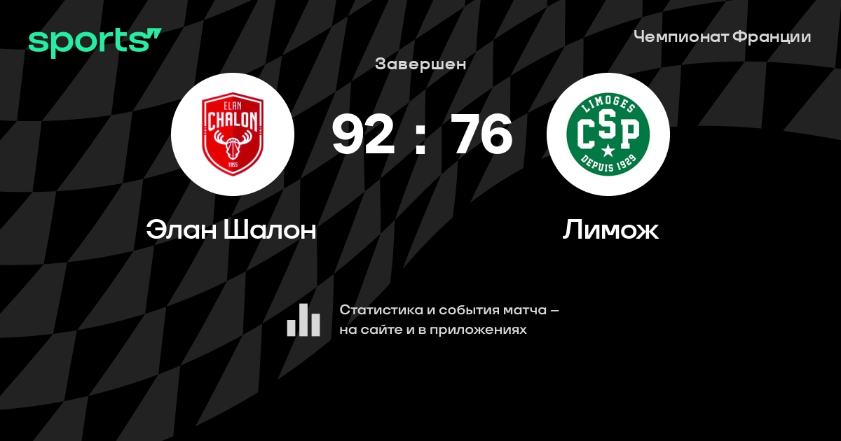 В прошедшем матче в рамках турнира Чемпионат Франции состоялась встреча команд Элан Шалон - Лимож в городе на стадионе Le Colisée со счетом 92 : 76.