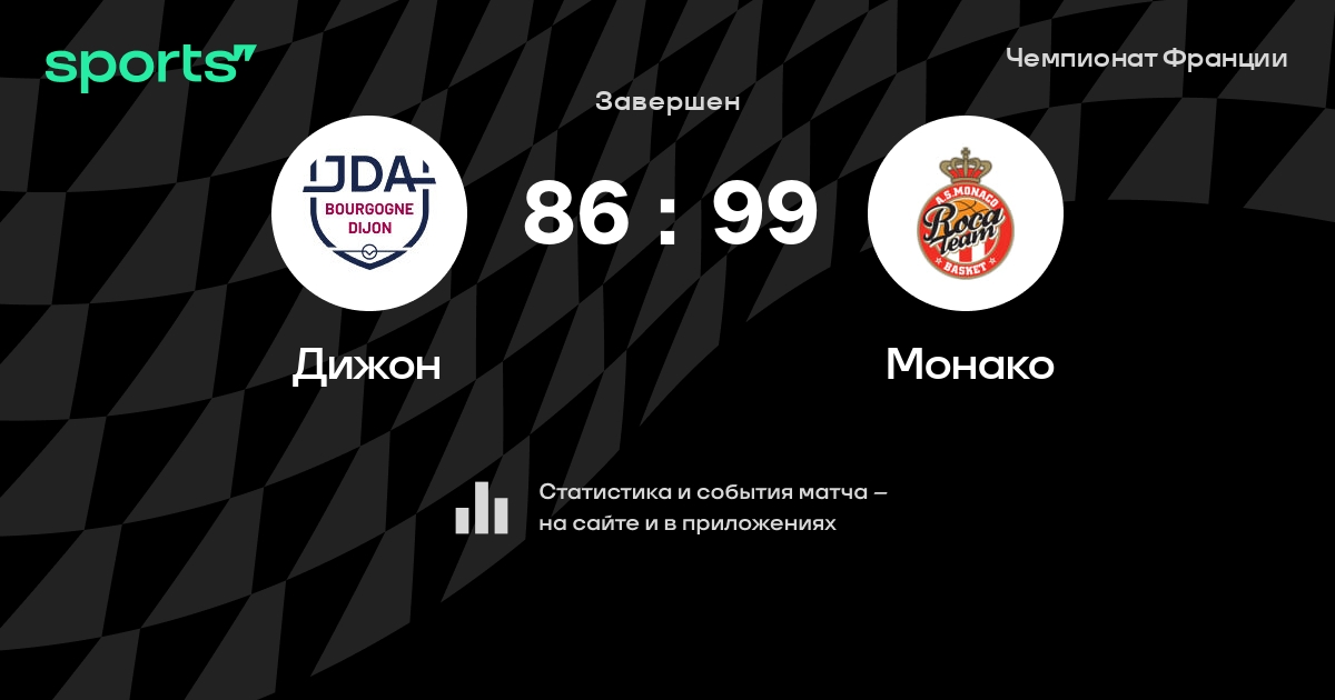 В прошедшем матче в рамках турнира Чемпионат Франции состоялась встреча команд Дижон - Монако в городе на стадионе Palais des Sports Jean-Michel Geoffroy со счетом 86 : 99.