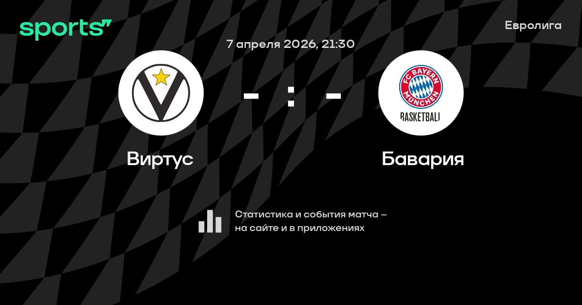 В предстоящем матче в рамках турнира Евролига пройдет встреча команд Виртус - Бавария . Начало встречи запланировано на 21:30 7 апреля, 2026 2026.