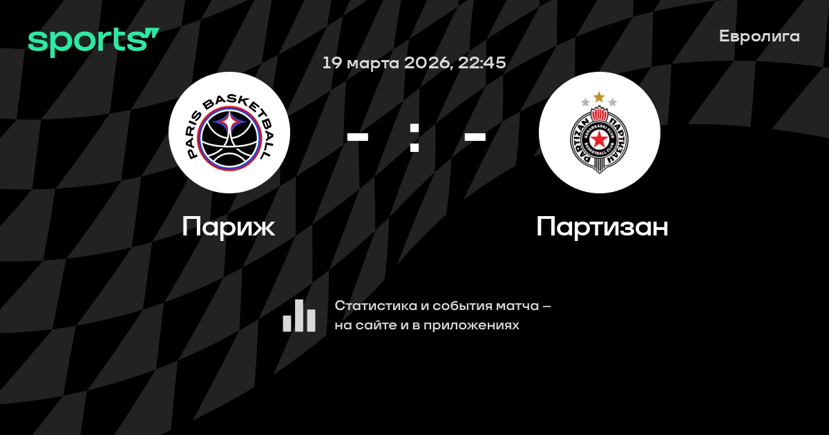 В предстоящем матче в рамках турнира Евролига пройдет встреча команд Париж - Партизан . Начало встречи запланировано на 22:45 19 марта, 2026 2026.