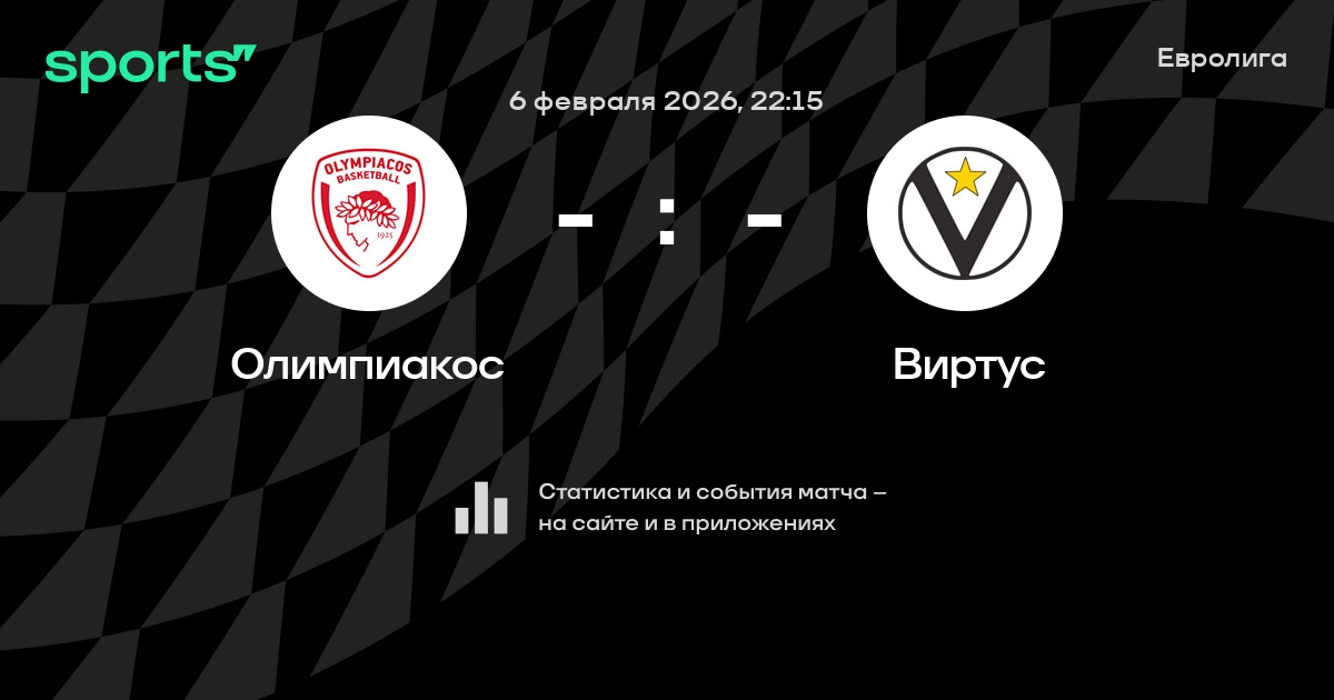 В предстоящем матче в рамках турнира Евролига пройдет встреча команд Олимпиакос - Виртус . Начало встречи запланировано на 22:15 6 февраля, 2026 2026.