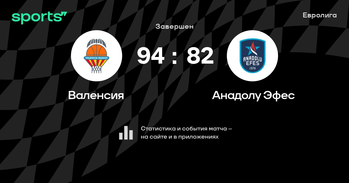 В прошедшем матче в рамках турнира Евролига состоялась встреча команд Валенсия - Анадолу Эфес в городе на стадионе Roig Arena со счетом 94 : 82.