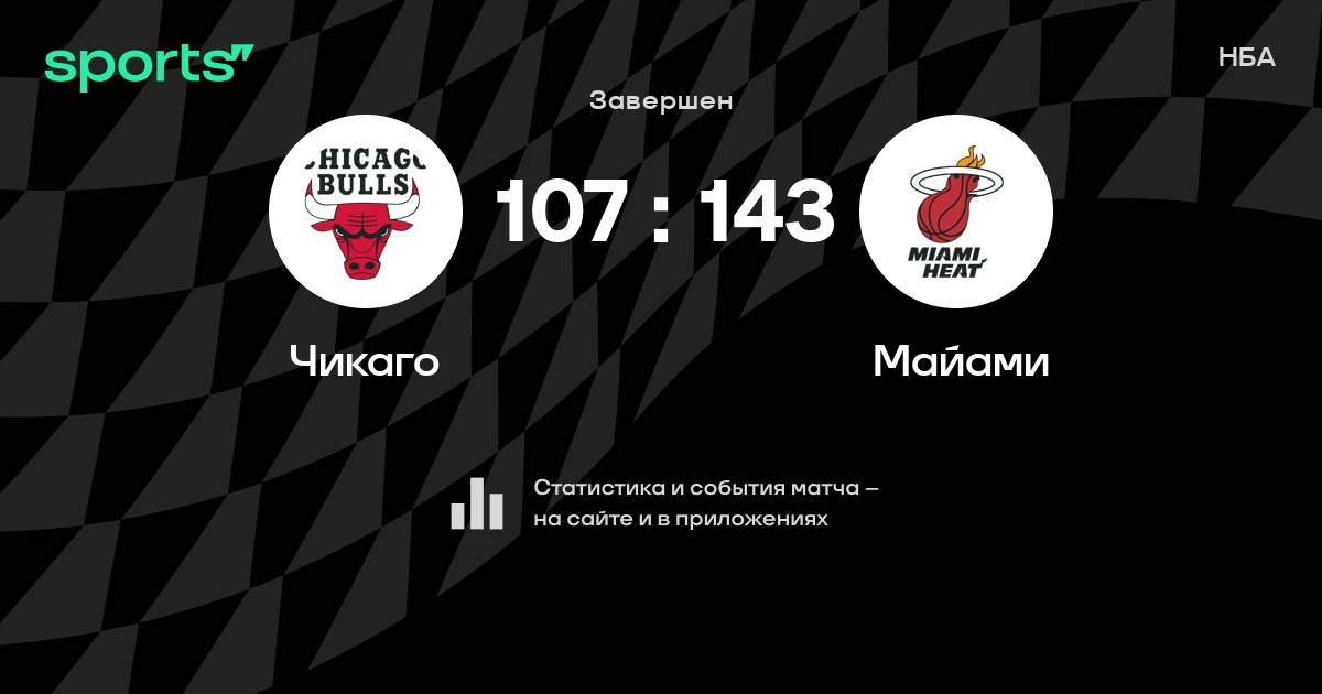 В прошедшем матче в рамках турнира НБА состоялась встреча команд Чикаго - Майами в городе Чикаго (США) на стадионе United Center (вместимость - 21711) со счетом 107 : 143.