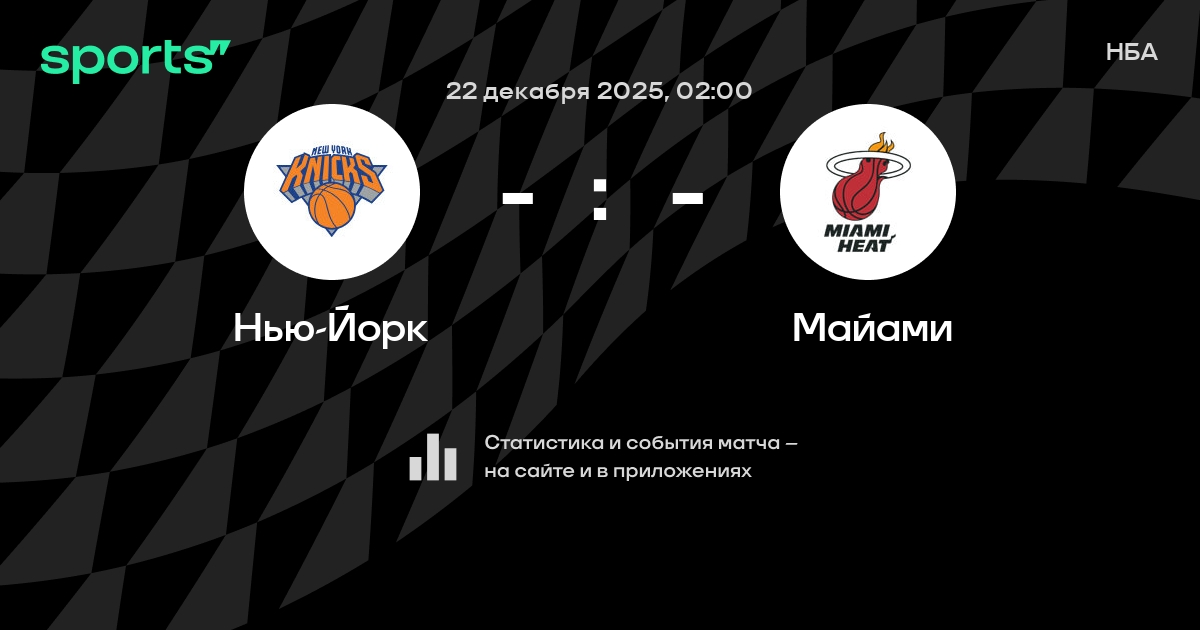 В предстоящем матче в рамках турнира НБА пройдет встреча команд Нью-Йорк - Майами . Начало встречи запланировано на 02:00 22 декабря 2025.