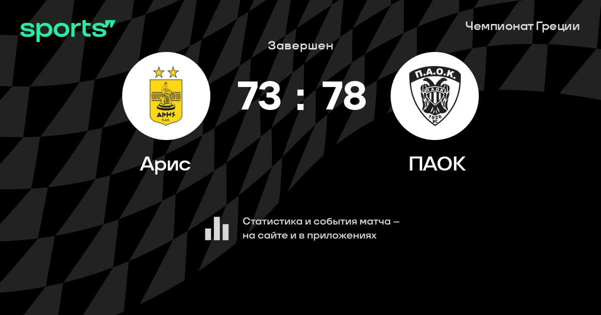 В прошедшем матче в рамках турнира Чемпионат Греции состоялась встреча команд Арис - ПАОК в городе на стадионе Sala Alexandreio Melathron Nikos Galis со счетом 73 : 78.