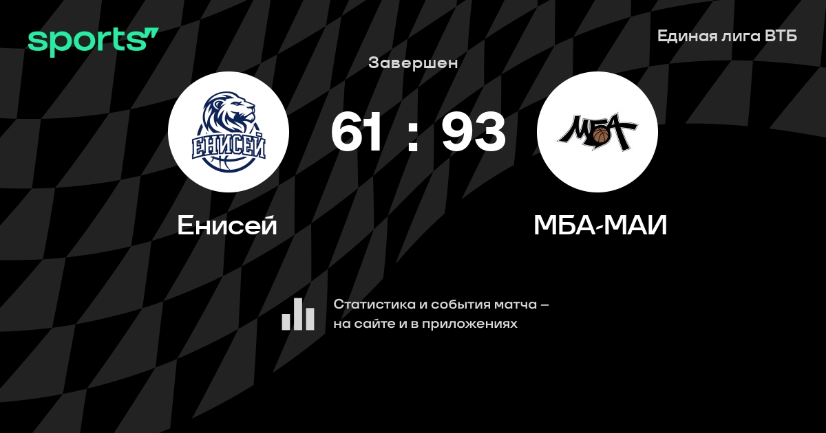 В прошедшем матче в рамках турнира Единая лига ВТБ состоялась встреча команд Енисей - МБА-МАИ в городе Красноярск (Россия) на стадионе Арена-Север со счетом 61 : 93.