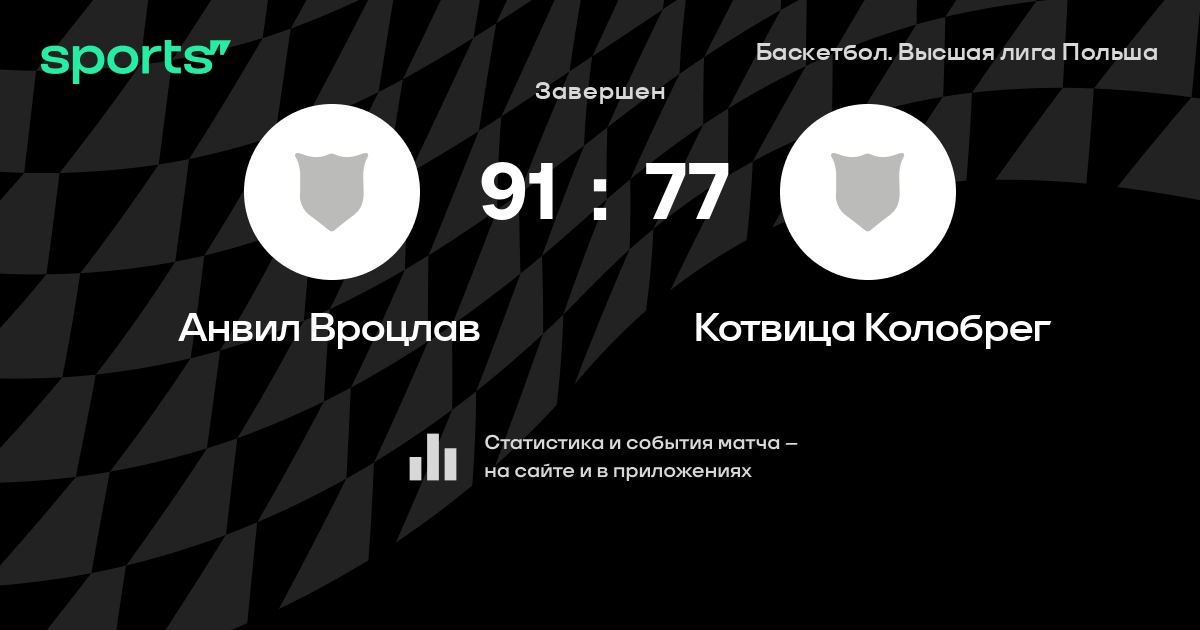 В прошедшем матче в рамках турнира Баскетбол. Высшая лига Польша состоялась встреча команд Анвил Вроцлав - Котвица Колобрег со счетом 91 : 77.