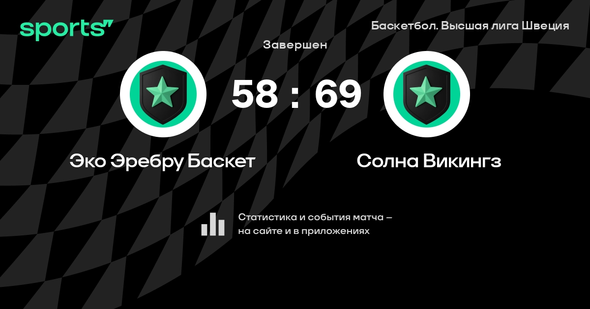 В прошедшем матче в рамках турнира Баскетбол. Высшая лига Швеция состоялась встреча команд Эко Эребру Баскет - Солна Викингз со счетом 58 : 69.