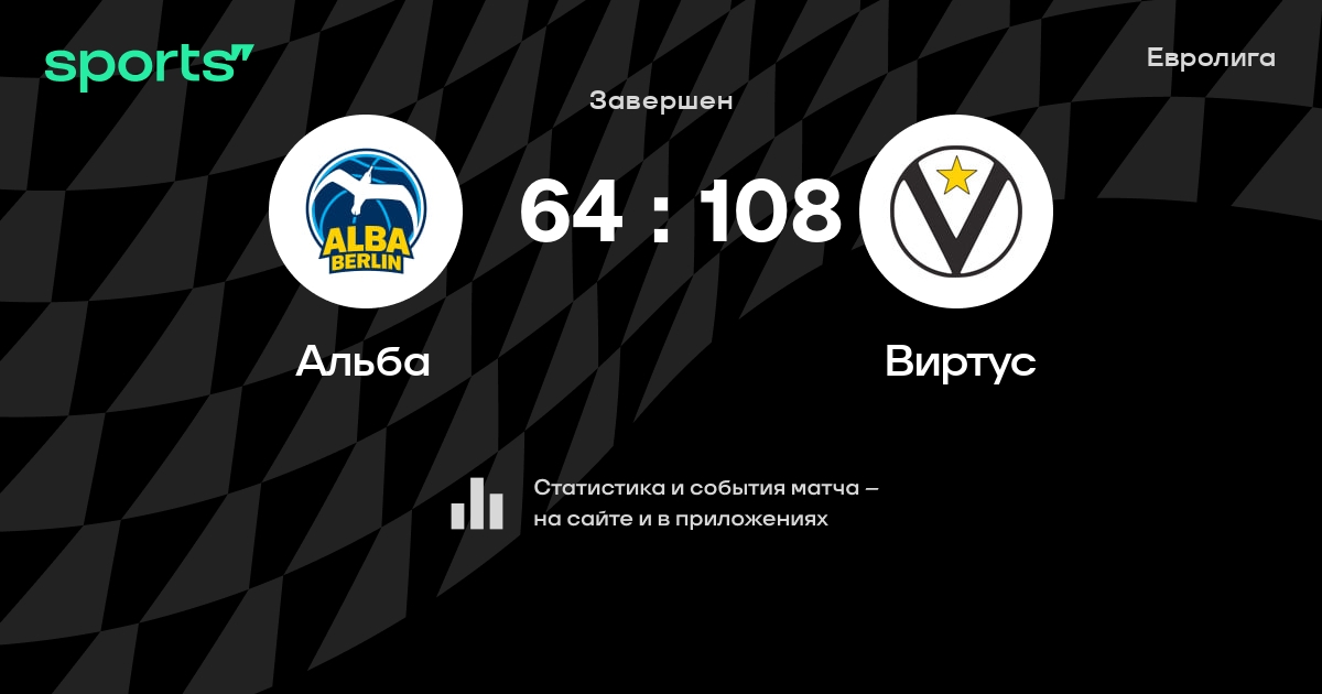 В прошедшем матче в рамках турнира Евролига состоялась встреча команд Альба - Виртус в городе Берлин (Германия) на стадионе Убер Арена (вместимость - 16000)