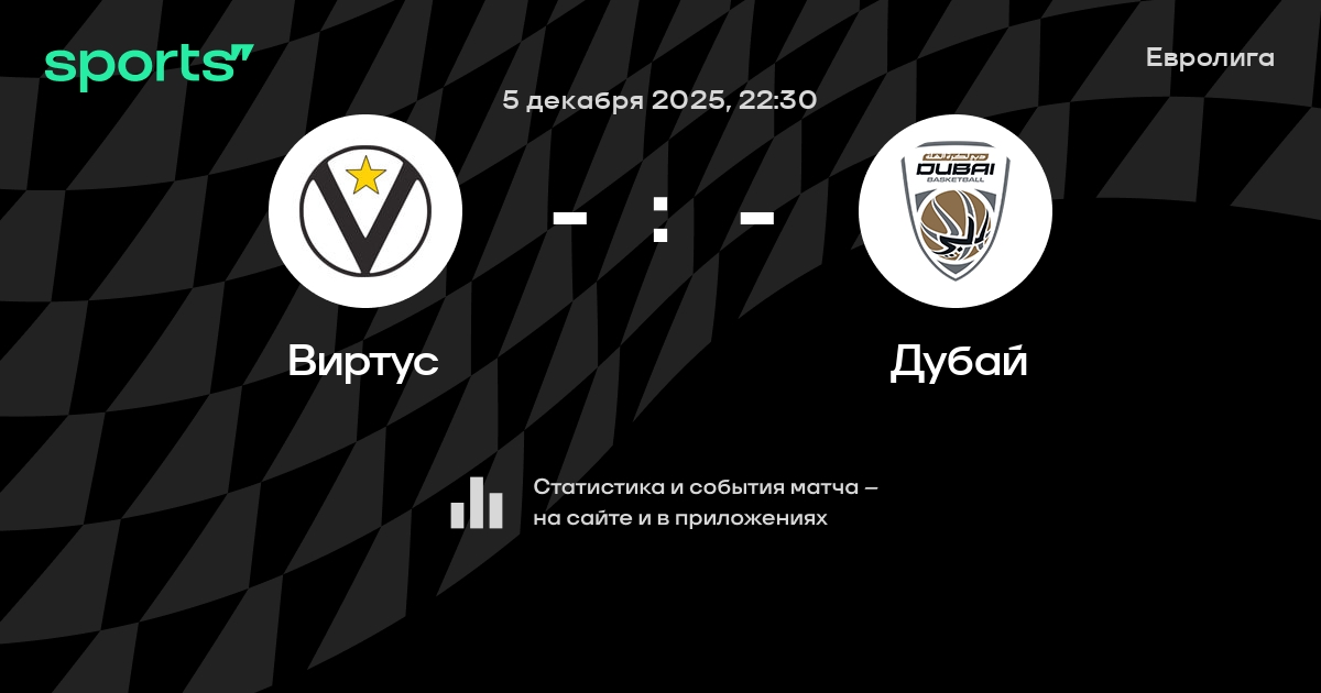 В предстоящем матче в рамках турнира Евролига пройдет встреча команд Виртус - Дубай . Начало встречи запланировано на 22:30 5 декабря 2025.