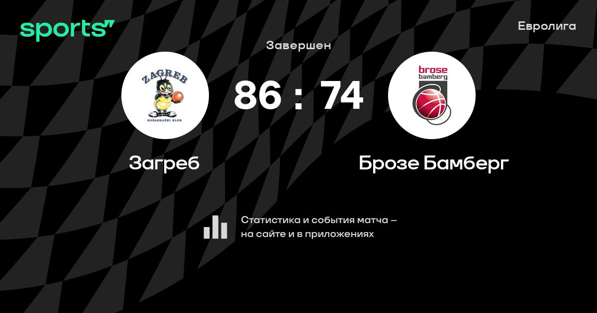 В прошедшем матче в рамках турнира Евролига Группа B состоялась встреча команд Загреб - Брозе Бамберг в городе Zagreb на стадионе Dvorana Trnsko со счетом 86 : 74.