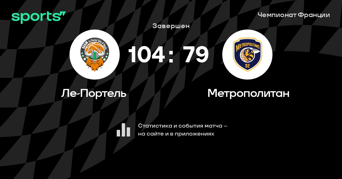 В прошедшем матче в рамках турнира Чемпионат Франции состоялась встреча команд Ле-Портель - Метрополитан в городе на стадионе Le Chaudron со счетом 104 : 79.