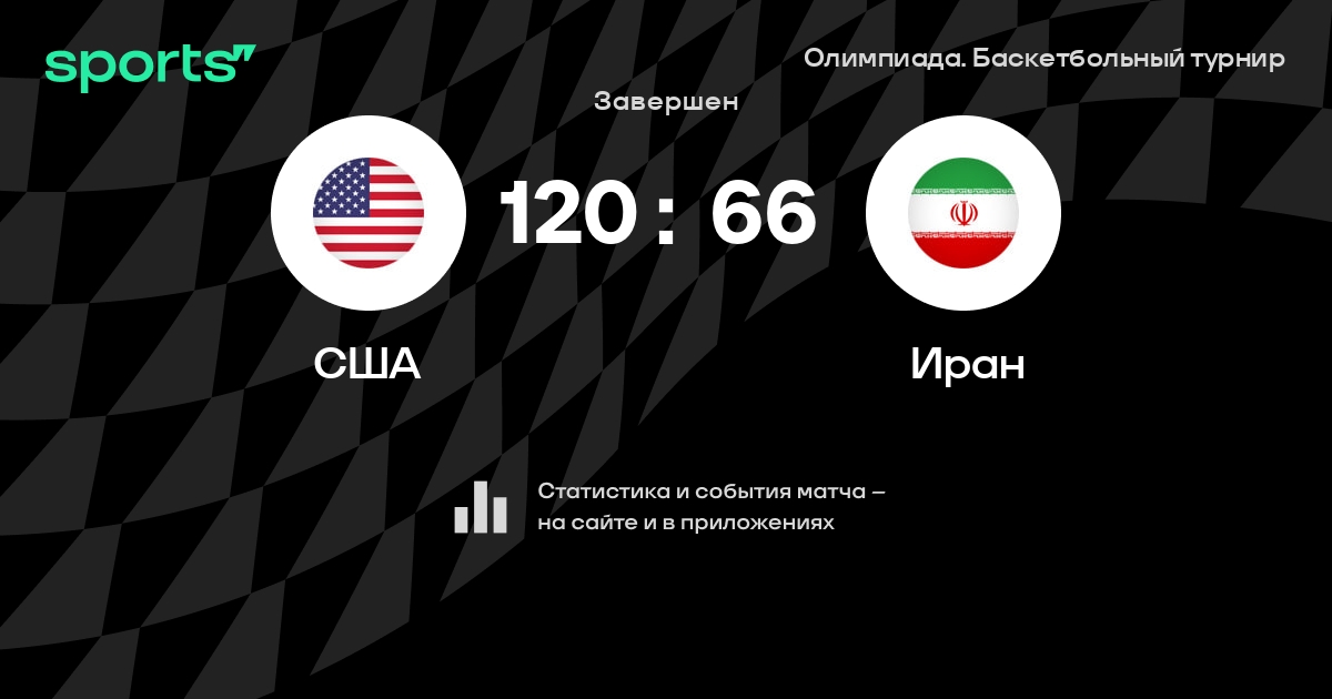 В прошедшем матче в рамках турнира Олимпиада. Баскетбольный турнир состоялась встреча команд США - Иран в городе Saitama на стадионе Saitama Super Arena со счетом 120 : 66.