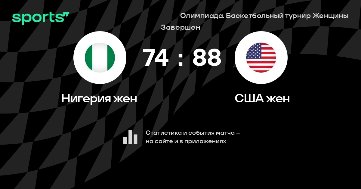 В прошедшем матче в рамках турнира Олимпиада. Баскетбольный турнир Женщины Четвертьфинал состоялась встреча команд Нигерия жен - США жен в городе Париж (Франция) на стадионе Аккор Арена (вместимость - 15609)