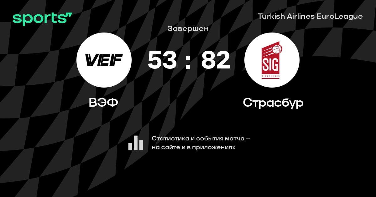 В прошедшем матче в рамках турнира Turkish Airlines EuroLeague 1-й квалификационный раунд состоялась встреча команд ВЭФ - Страсбур в городе Остенде (Бельгия) на стадионе Слейтер Арена (вместимость - 5000)