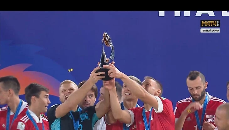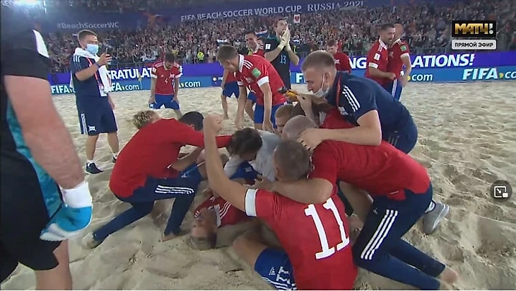 21:18. А наши парни празднуют победу с золотыми медалями и кубком! Чемпионат мира по пляжному футболу-2021 в Москве завершился!