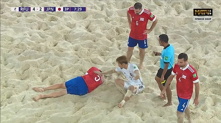 20:26. Японец Оба получает желтую карту – ногой зарядил по шее Крашенинникову. Юрий долго лежал на песке – удар очень неприятный.