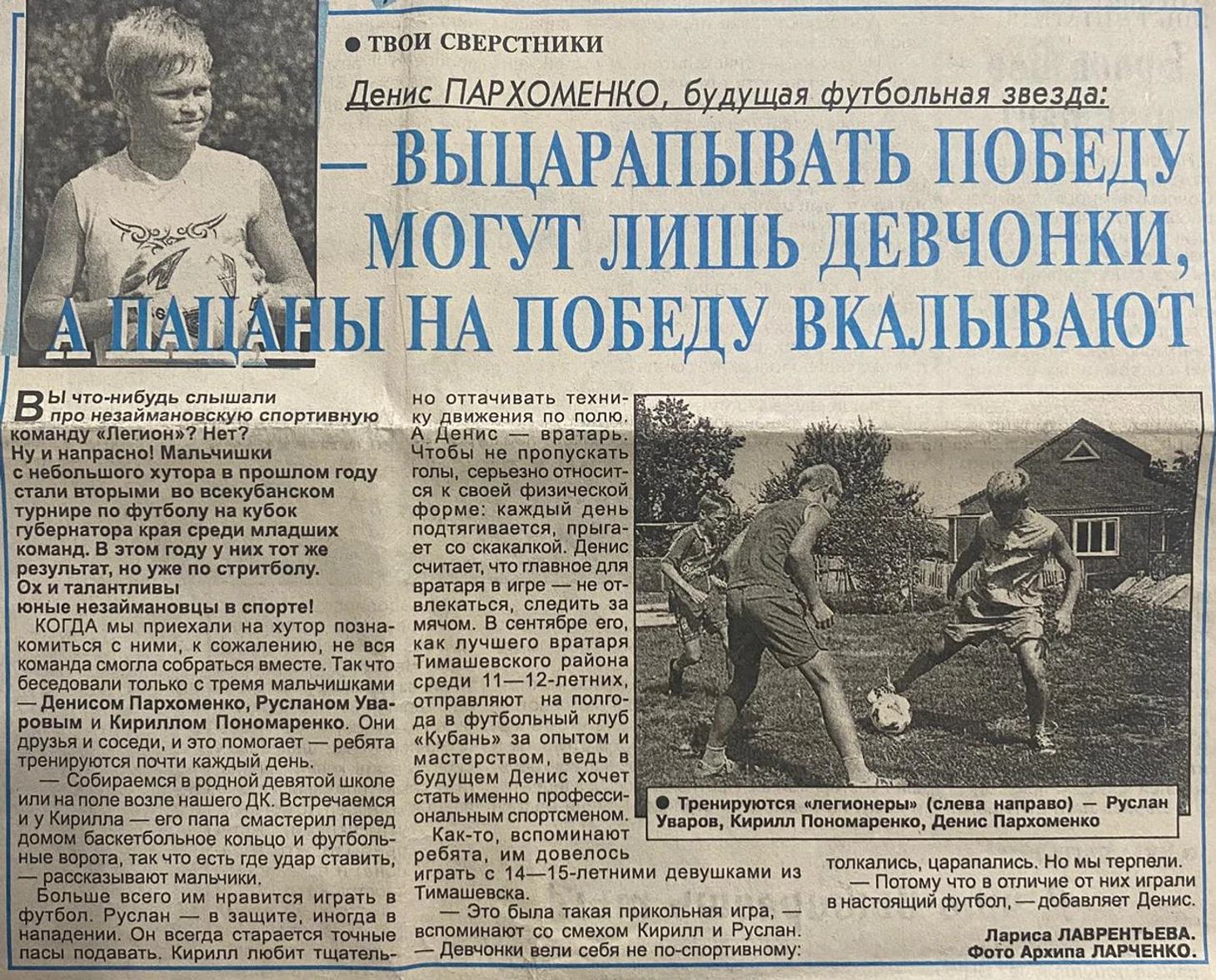 Чемпион мира по пляжному футболу 2021 года Денис Пархоменко поделился со мной архивной статьёй из газеты «Зеркало» 2009 года. Журналист, который брал интервью у Дениса и друзей, похоже, знал будущее. Заголовок получился громким и провидческим: «Денис Пархоменко, будущая футбольная звезда…».