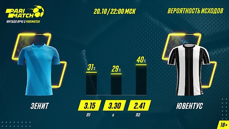 По оценкам аналитиков Parimatch, шансы итальянской команды на победу выше, чем у чемпиона России. Сделать ставку на «Старую синьору» можно с коэффициентом 2.41 (соответствует примерно 40%). Взять победу хозяев можно за 3.15 (31%), коэффициент на ничью — 3.30 (29%).
