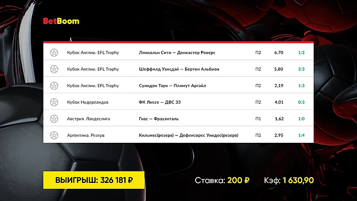 Клиент букмекерской компании BetBoom собрал удачный экспресс из шести футбольных матчей, который принес ему 326 181 рубль. Коэффициент купона составил 1630,90, беттор поставил всего 200 рублей.