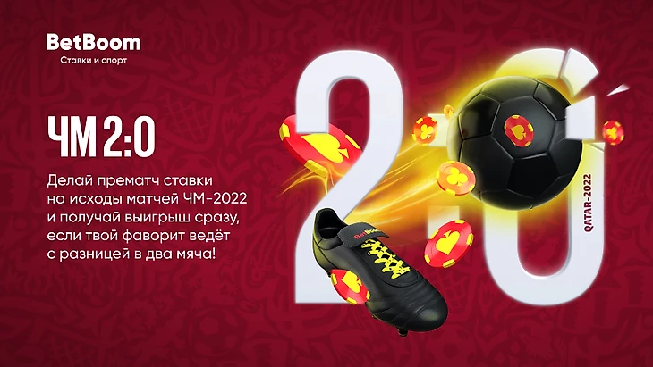 К началу Чемпионата мира по футболу 2022 в Катаре БК BetBoom запустила акцию «ЧМ 2:0». По условиям промо, букмекер досрочно рассчитывает пари игрокам, поставившим на победу команды, которая по ходу матча повела в два мяча. Так, 28 ноября, компания досрочно выплатила выигрыш всем, кто поставил на победу Сербии в матче против Камеруна в рамках второго тура Чемпионата мира.