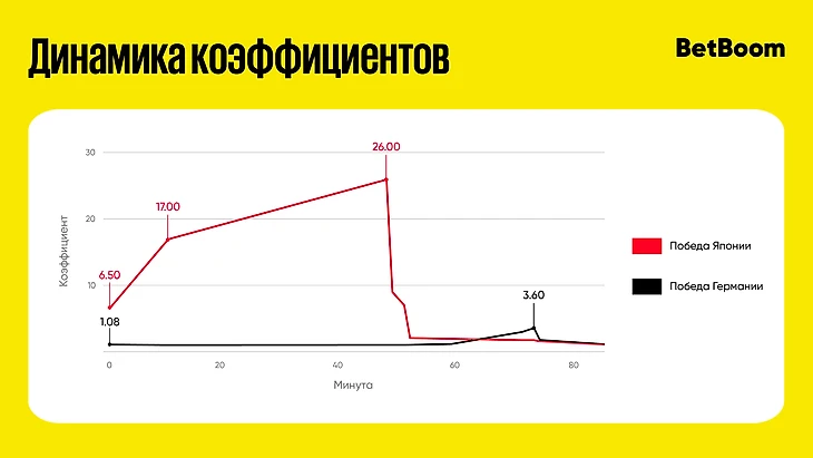 Максимальный кэф на Японию составлял 26, столько давали в самом начале второго тайма. На Германию принимали ставки по 3.60, когда Коста-Рика совершила камбэк.
