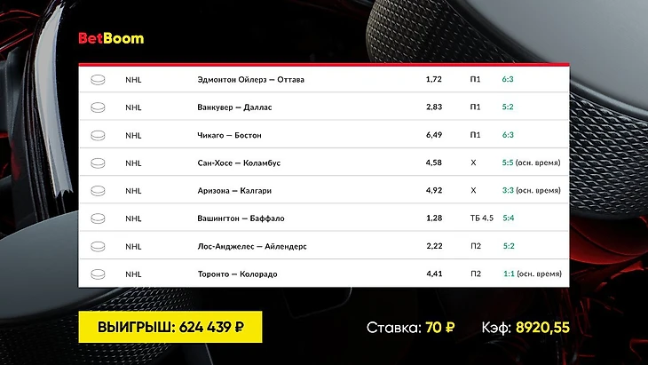 У клиента BetBoom зашел невероятный экспресс с кэфом 8920! Все ставки – на NHL