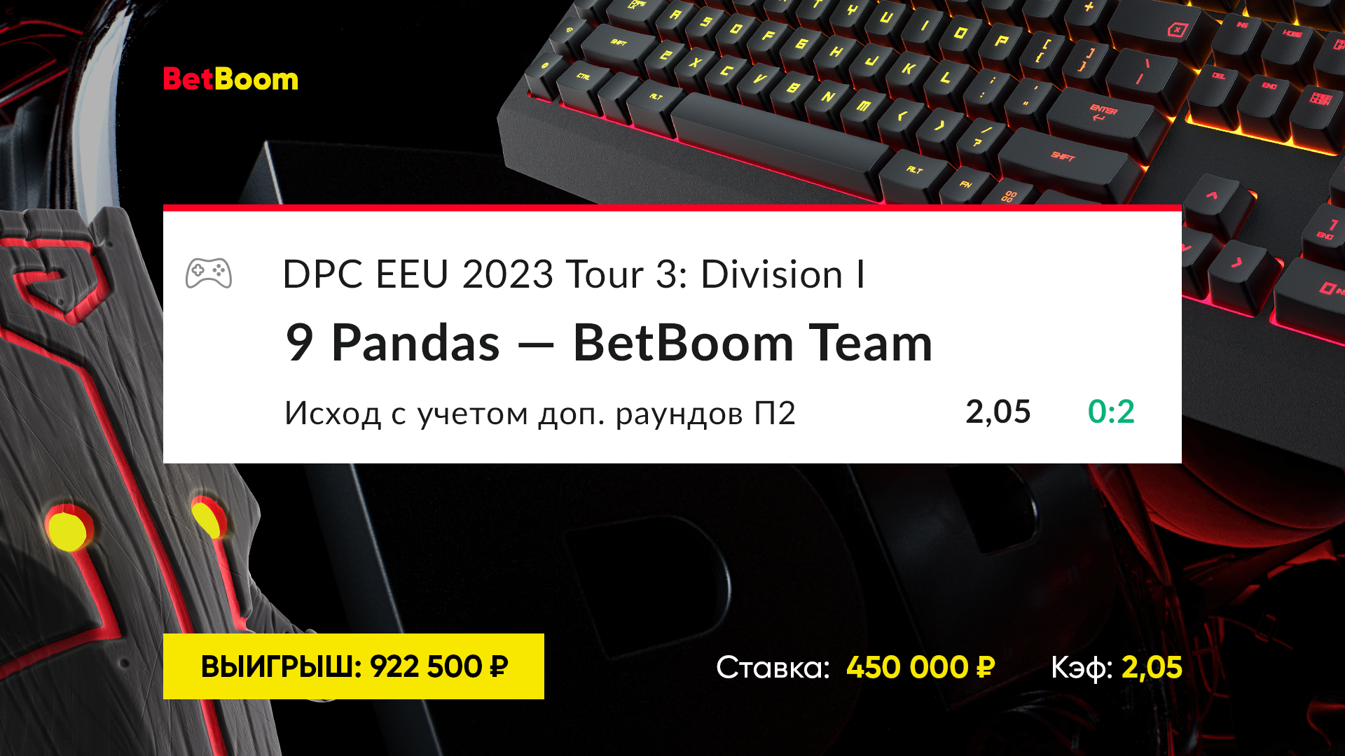 Осталась неделя до завершения DPC EEU 2023 Tour 3: Division I в Восточной Европе. Клиент BetBoom успешно предсказал победу состава BetBoom Team в матче против 9 Pandas, поставив 450 000 рублей. Кэф его ординара был 2.05, он смог поднять 922 500 рублей.