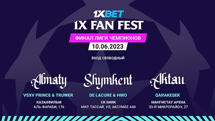 Спонсор спортивных эмоций 1XBET объявляют о запуске футбольных фестивалей, посвященного финалу Лиги чемпионов 1X Fan Fest. Три города – три праздника спорта! Алматы, Актау и Шымкент, ждите большие трансляции финала. Уже 10 июня компания 1XBET проведет незабываемый просмотр главного матча года. Ожидается, что эти фан-зоны станут пиком спортивных мероприятий в стране, и поклонники смогут испытать незабываемые эмоции от футбольного праздника. Фан-зоны 1X Fan Fest расположатся на территории больших площадок – «Мангыстау Арена» в городе Актау (33-й микрорайон, 27), СК «БИИК» в городе Шымкент (мкр. Тассай, ул. Аксумбе, 440) и Музей кино имени Ш. Айманова в городе Алматы (проспект Аль-Фараби, 176).