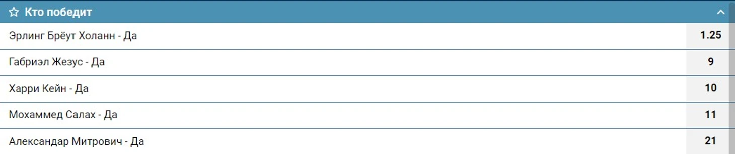 На то, что Эрлинг станет лучшим бомбардиром АПЛ-2022/23 дают коэффициент 1.25, то есть 80% вероятности. Главный конкурент норвежца – Габриэль Жесус (меньше 10%), который пока забил лишь три мяча.