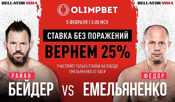В линии Olimpbet можно поставить на все поединки вечера, в том числе на бой Емельяненко с Бейдером. Коэффициент на победу россиянина — 2.70, на американца — за 1.50. Делайте ставку на победу Емельяненко, а если он проиграет, то Olimpbet вернет 25%!