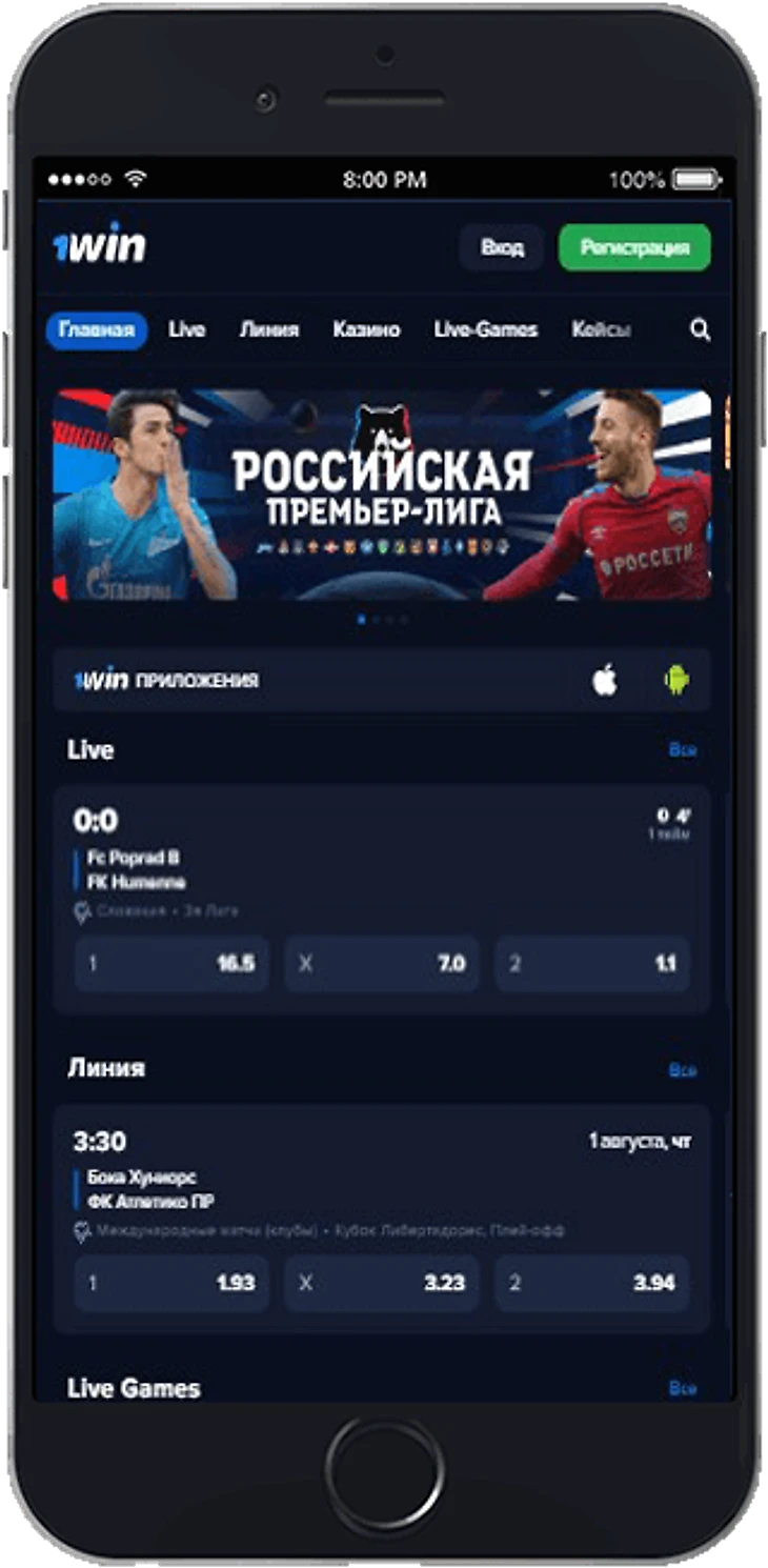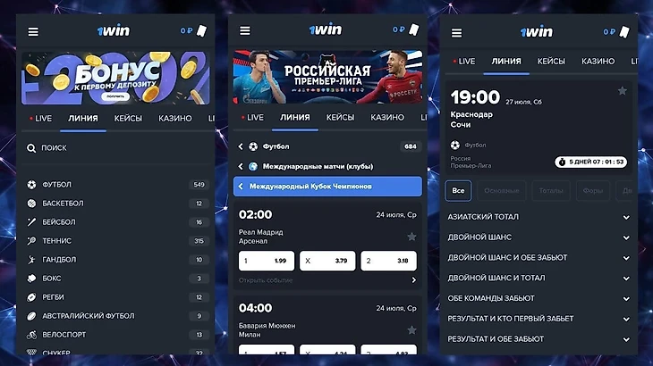 В нижней части экрана приложения располагаются пять основных разделов (Главная, Live, Купон, Казино, Live-games). А в верхней части экрана эти же разделы, но плюс к ним есть еще (Статистика, Киберспорт, Aviator, Лидерборд, игры, Vsport, Betgames, TVBET, 1Win Tv, Poker, 1 win invest, Кейсы)