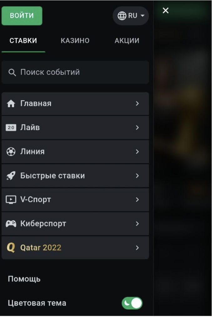 Навигационное меню – в левом верхнем углу. В нем можно переключиться между ставками на спорт и казино, просмотреть доступные акции. Здесь же – кнопка смены языка. Доступно шесть версий, среди которых есть русская. Также здесь продублированы основные игровые разделы из шапки сайта и добавлены другие: «Быстрые ставки», «Киберспорт».