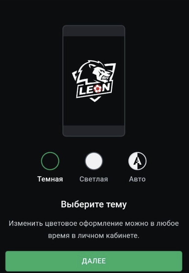 У приложения Leonbets на «Андроид» есть два вида дизайна – со светлой и темной темой, также присутствует режим «Авто». Ее следует выбрать при первом входе в приложение, а изменить всегда можно в личном кабинете.