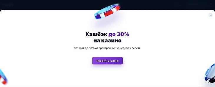 Кэшбэк — возврат до 30% от проигранных за неделю средств.
