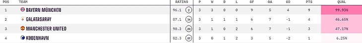 За второе место поборются «Галатасарай» (4 очка) и «Манчестер Юнайтед» (3 очка). Opta считает их шансы на продолжение борьбы в Лиге чемпионов почти одинаковыми – 47,17% против 46,65% в пользу английского клуба.
