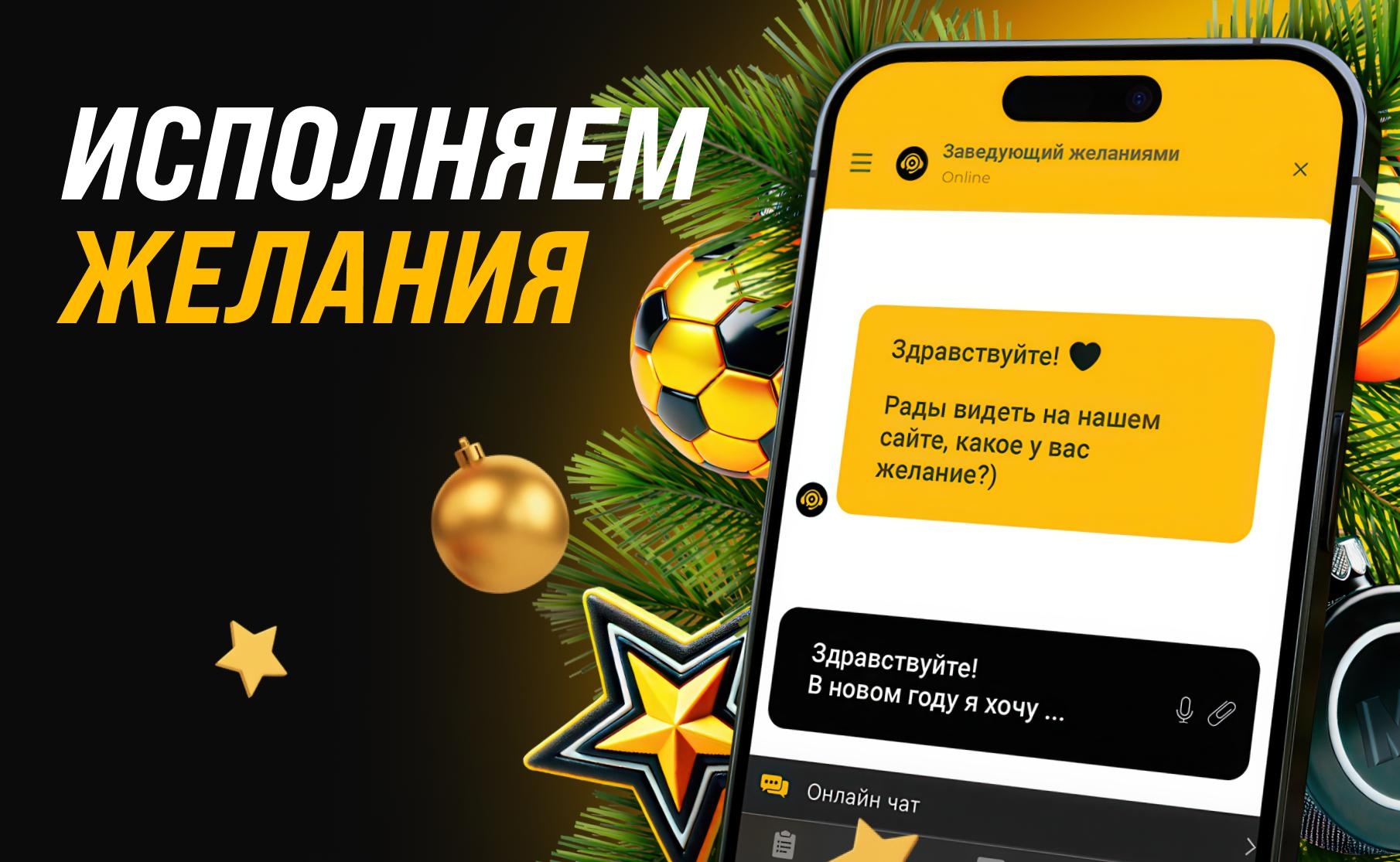 БК «Мелбет» исполняет желания! Для того, чтобы ваше желание исполнилось, необходимо заключить любое пари от 1 000 ₽ с кэфом от 1,5. Далее написать в онлайн-чат поддержки на сайте или в приложении свое заветное желание и город проживания. Каждый день декабря новогодний рандомайзер будет отбирать одно желание, которое исполнит БК «Мелбет». Чем больше пари, тем выше шанс, что именно твое желание будет исполнено.