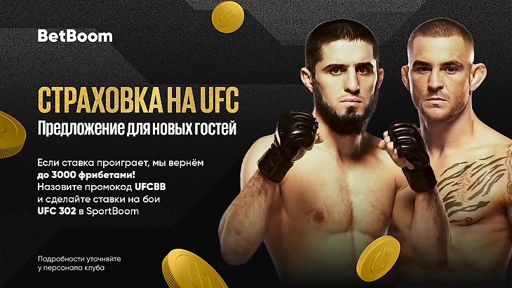 В ночь с 1 на 2 июня состоится турнир UFC 302. В главном поединке вечера встретятся Ислам Махачев и Дастин Порье, которые будут бороться за титул в легком весе. В честь этого события в клубах BetBoom для новых гостей начинается акция «Страховка на UFC».
