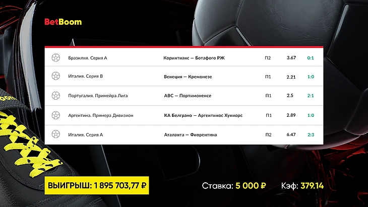 Несмотря на минимальную победу каждой из команд в экспрессе, большинство игр прошли без нервов для клиента BetBoom. «Венеция» Дениса Черышева забила «Кремонезе» уже в середине первого тайма и удержала нужную разницу до конца встречи, обеспечив выход в первый дивизион Италии. АВС открыл счёт против «Портимоненсе» на 51-ой минуте, затем в концовке матча команды обменялись голами, не повлиявшими на исход. «Ботафого» поразил ворота «Коринтианса» в середине игры и сел в оборону, не позволив хозяевам создать ни одного явного голевого момента за весь матч.