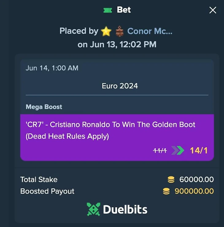 Ирландский боец поставил 60 тысяч фунтов с коэффициентом 15.00 на то, то 39-летний форвард сборной Португалии выиграет «Золотую бутсу» на турнире в Германии.