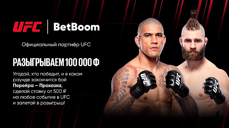 Официальный партнер UFC букмекерская компания BetBoom запустила уникальную акцию – сделай прогноз на победителя в главном событии номерного турнира Алекс Перейра – Иржи Прохазка, сделай ставку от 500 ₽ на любое событие UFC и участвуй в розыгрыше 100 000 фрибетов!