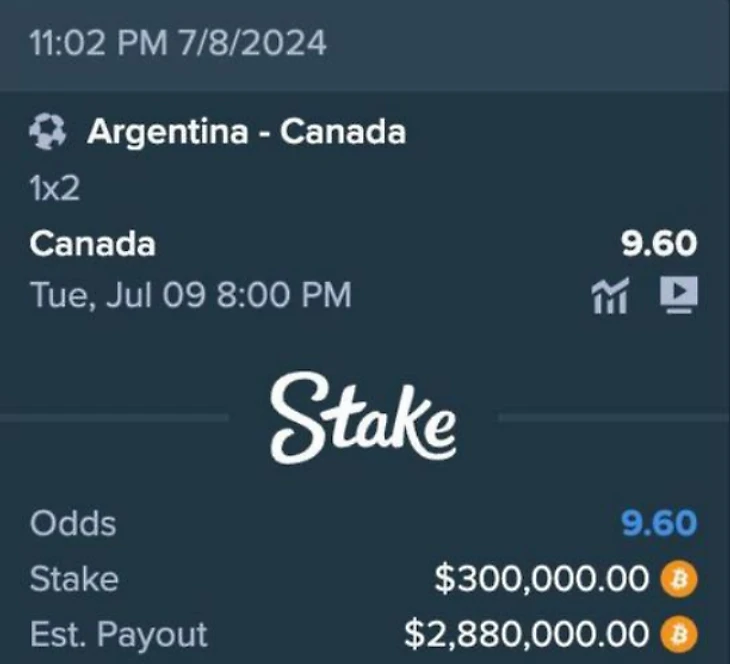 Канадский музыкант поставил 300 тысяч долларов на победу своей сборной с коэффициентом 9.60. Потенциальный выигрыш может составить 2,9 миллиона долларов.