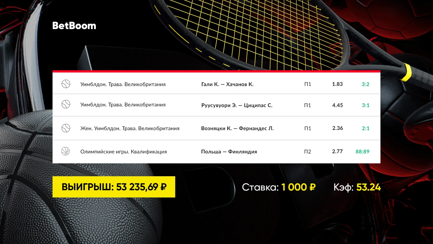 Клиент BetBoom удачно сориентировался и собрал экспресс из трех исходов на Уимблдон, два из которых в лайве, а также одного из матчей квалификации на Олимпийский турнир по баскетболу. Зашедший купон принес беттору 53 235 рублей со ставки в 1 000! Коэффициент экспресса составил 53.24.
