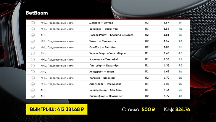 Прошлое воскресенье оказалось удачным для клиента BetBoom. Беттор собрал экспресс из исходов на предсезонные турниры НХЛ и АХЛ. Итоговый коэффициент купона составил 824.76. Со ставки в 500 клиент BetBoom поставил выиграл 412 382 рубля!